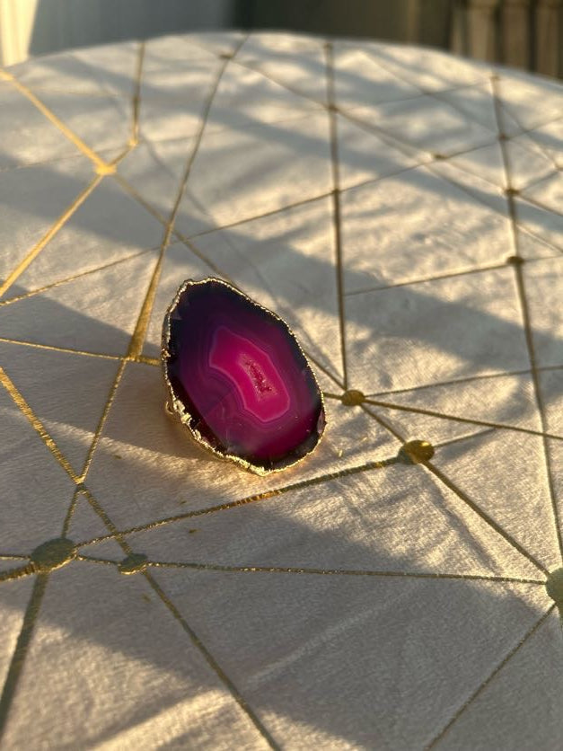 Une bague dorée à l’or fin ornée d’une grosse pierre d’agate violette flashy, pour une touche audacieuse et colorée.