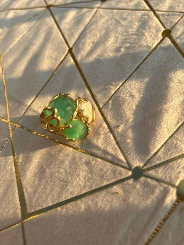 Une bague exquise dorée à l’or fin, ornée de pierres oeil de chat choisies par nos artisans, avec un fermoir élégant et travaillé.